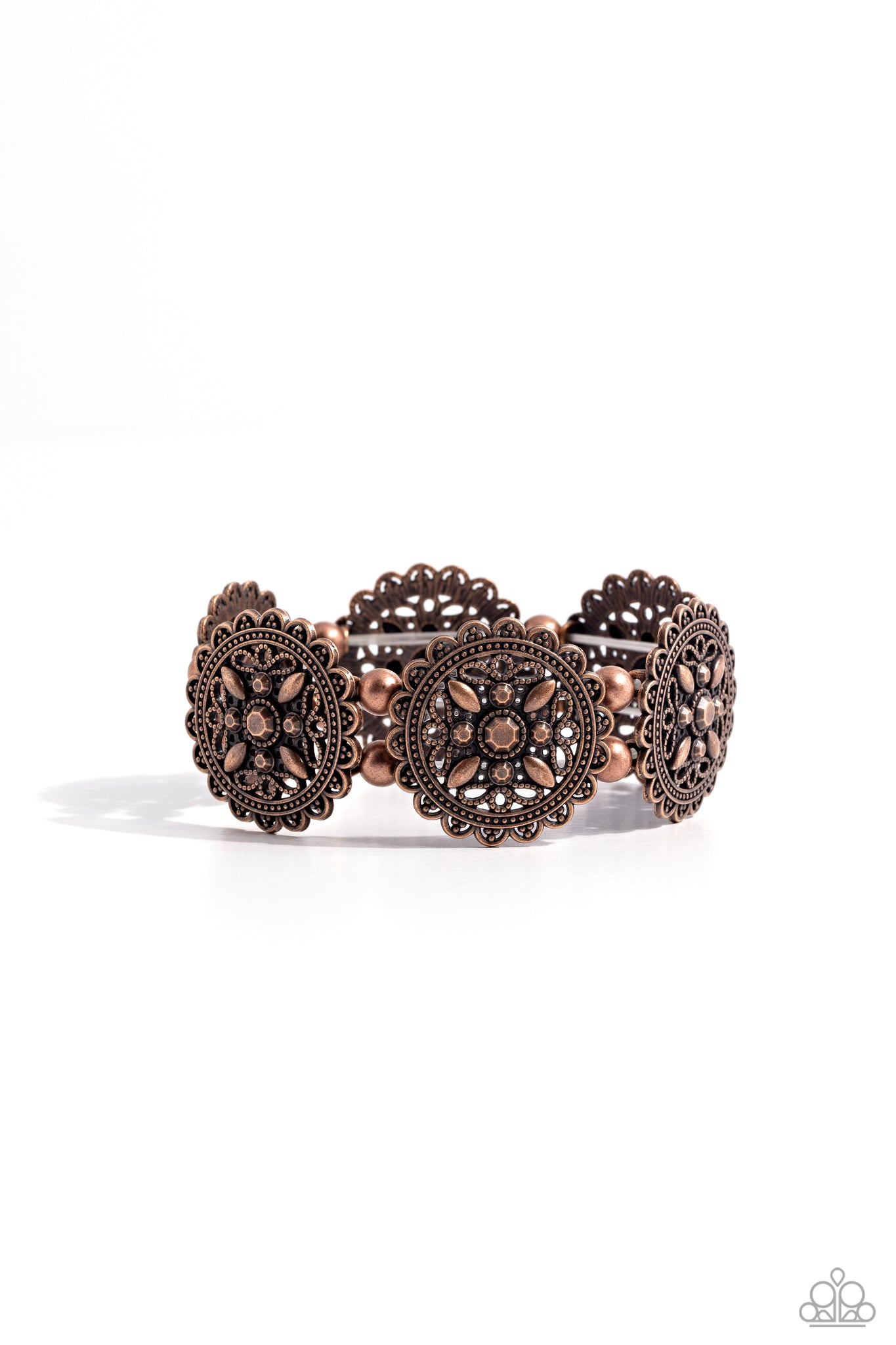 Filled with lace-like filigree, an antiqued collection of copper circular frames are delicately threaded along stretchy bands around the wrist for a whimsically vintage look. High-sheen copper beads separate each floral filigree disc for additional monochromatic glow.