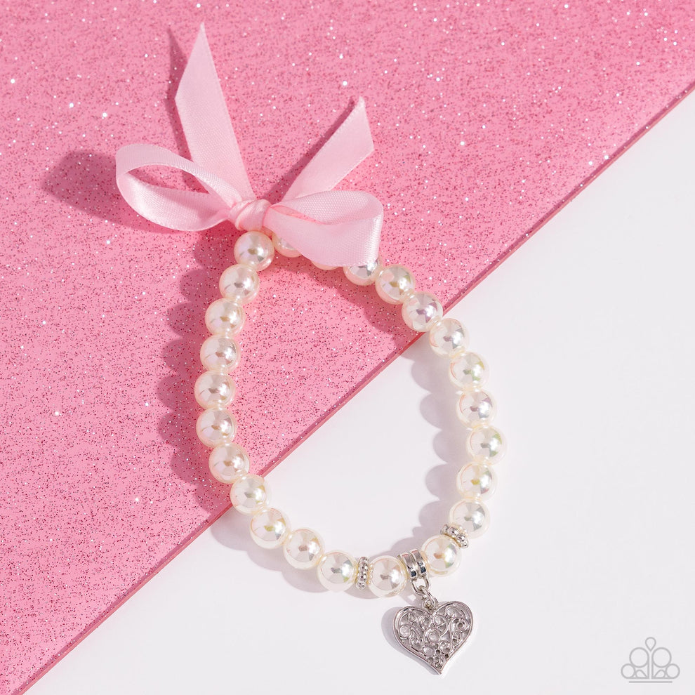 Iridescent pearls and silver beads are infused along an elastic stretchy band around the wrist. A baby pink ribbon is tied in a bow on one end of the display, while a silver filigree heart charm cascades from the other end for a refined centerpiece.