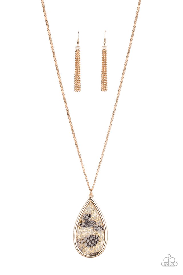 Featuring a metallic scale print, a piece of leather embellishes the center of an oversized gold teardrop at the bottom of a lengthened gold chain for a wild look. Features an adjustable clasp closure.