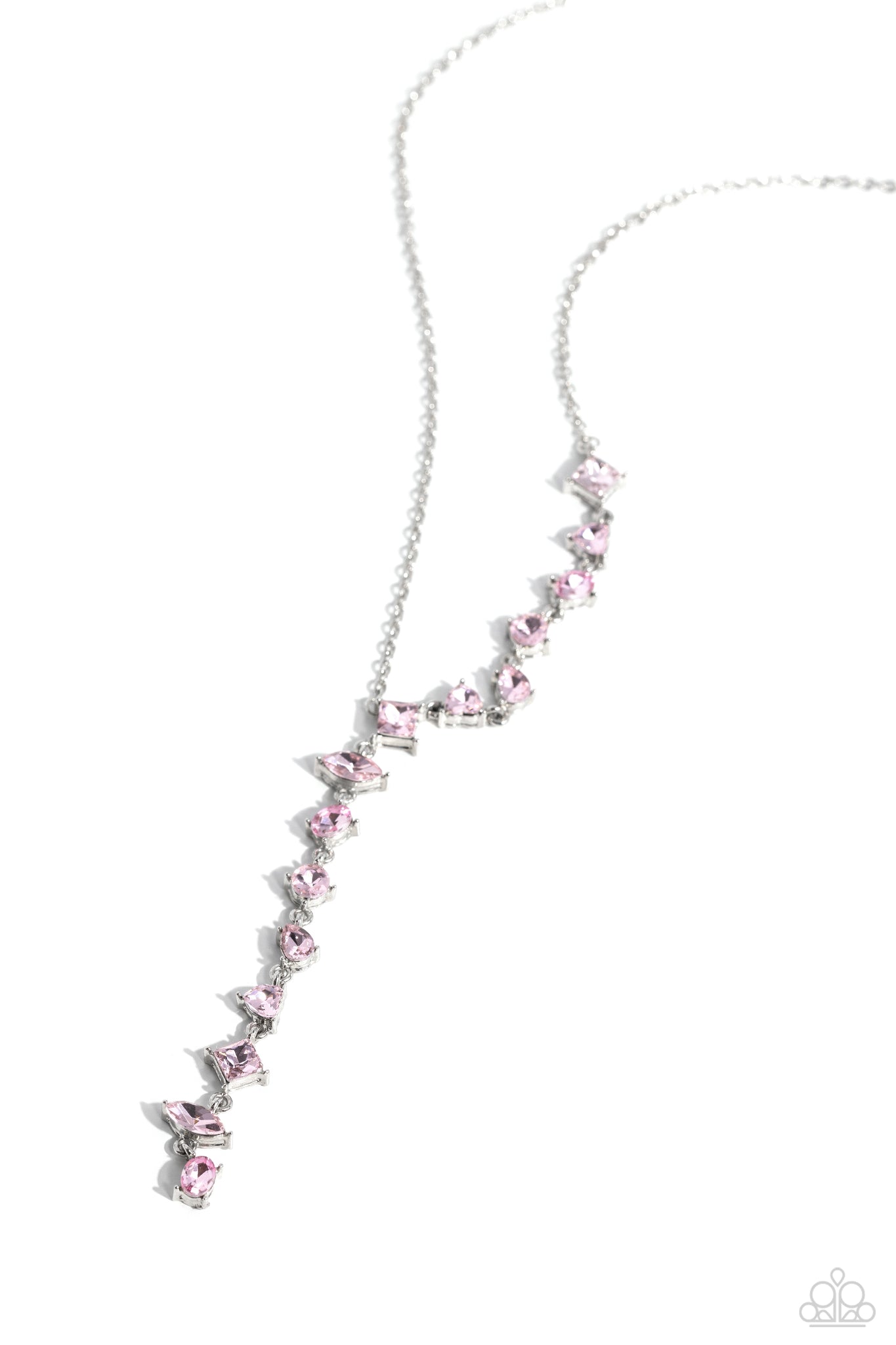 Featuring pronged fittings, a collection of baby pink square-cut, heart, oval, round, and teardrop gems cascade down the neckline in a diagonal pattern, creating an intense, incandescent statement piece. Features an adjustable clasp closure.