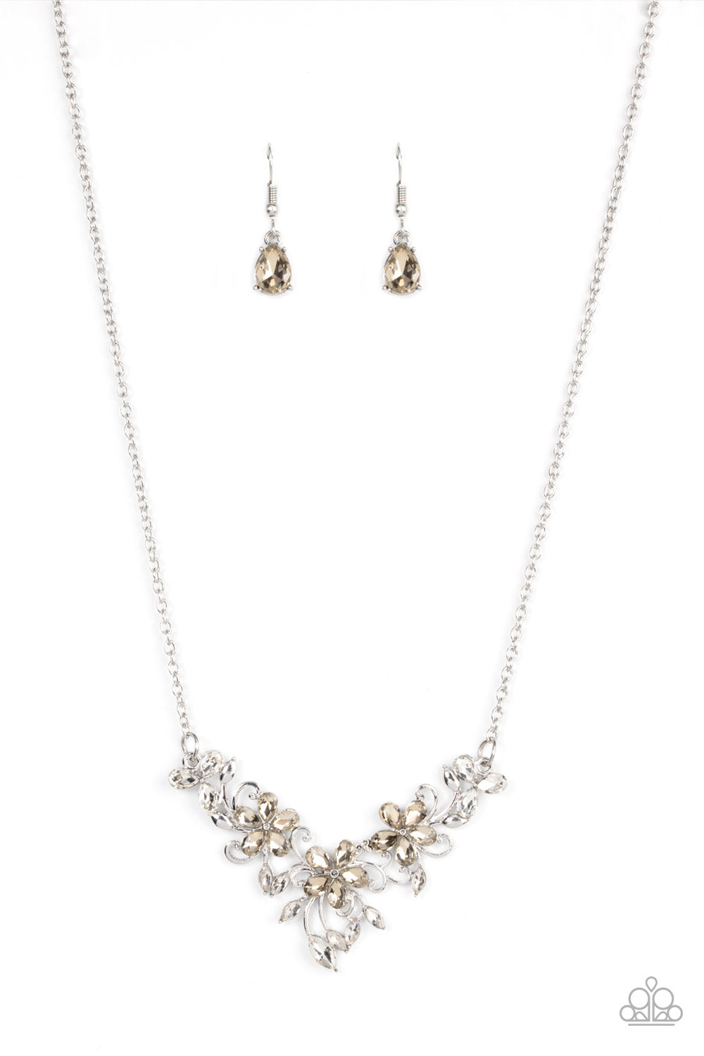 A twinkly trio of topaz rhinestone petaled flowers bloom atop a leafy silver backdrop adorned in marquise cut white rhinestones, resulting in a timeless floral centerpiece below the collar. Features an adjustable clasp closure.