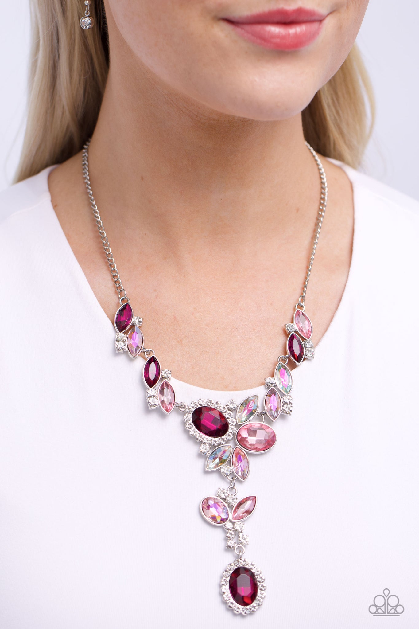 Featuring an iridescent shimmer, an unexpected explosion of oversized various pink oval and marquise-cut gems cluster into haphazard groupings. Silver-pronged white rhinestones sporadically dot across the abstract canvas and encircle a few iridescent ovals for additional shimmer. The blinding clusters link together, creating a soft statement piece that cascades below the collar. Features an adjustable clasp closure. Due to its prismatic palette, color may vary.