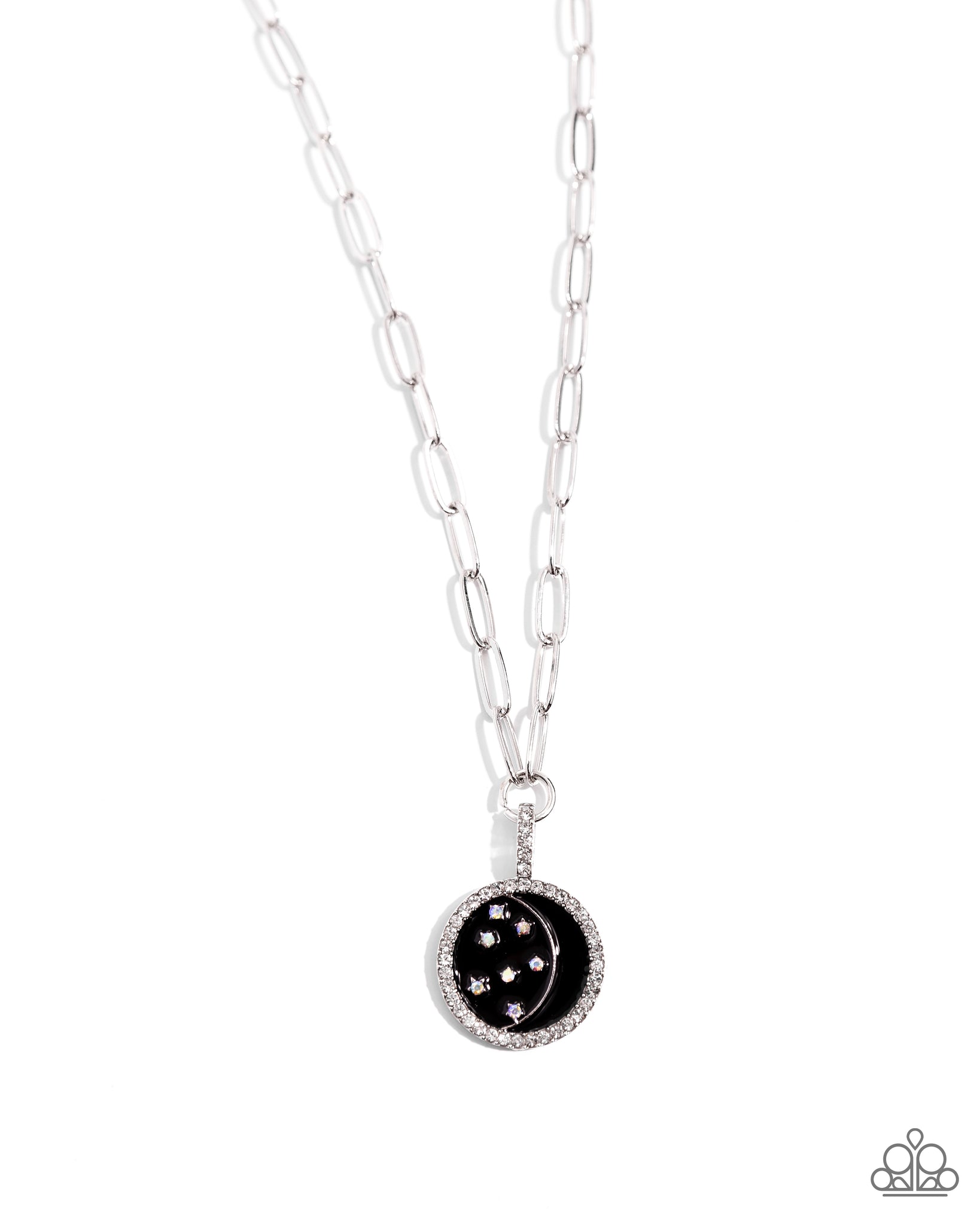 Featuring iridescent stars, a black-painted disc with a silver crescent moon outline and a border of white rhinestones twinkles from a silver paperclip chain for a celestial statement. Features an adjustable clasp closure. Due to its prismatic palette, color may vary.