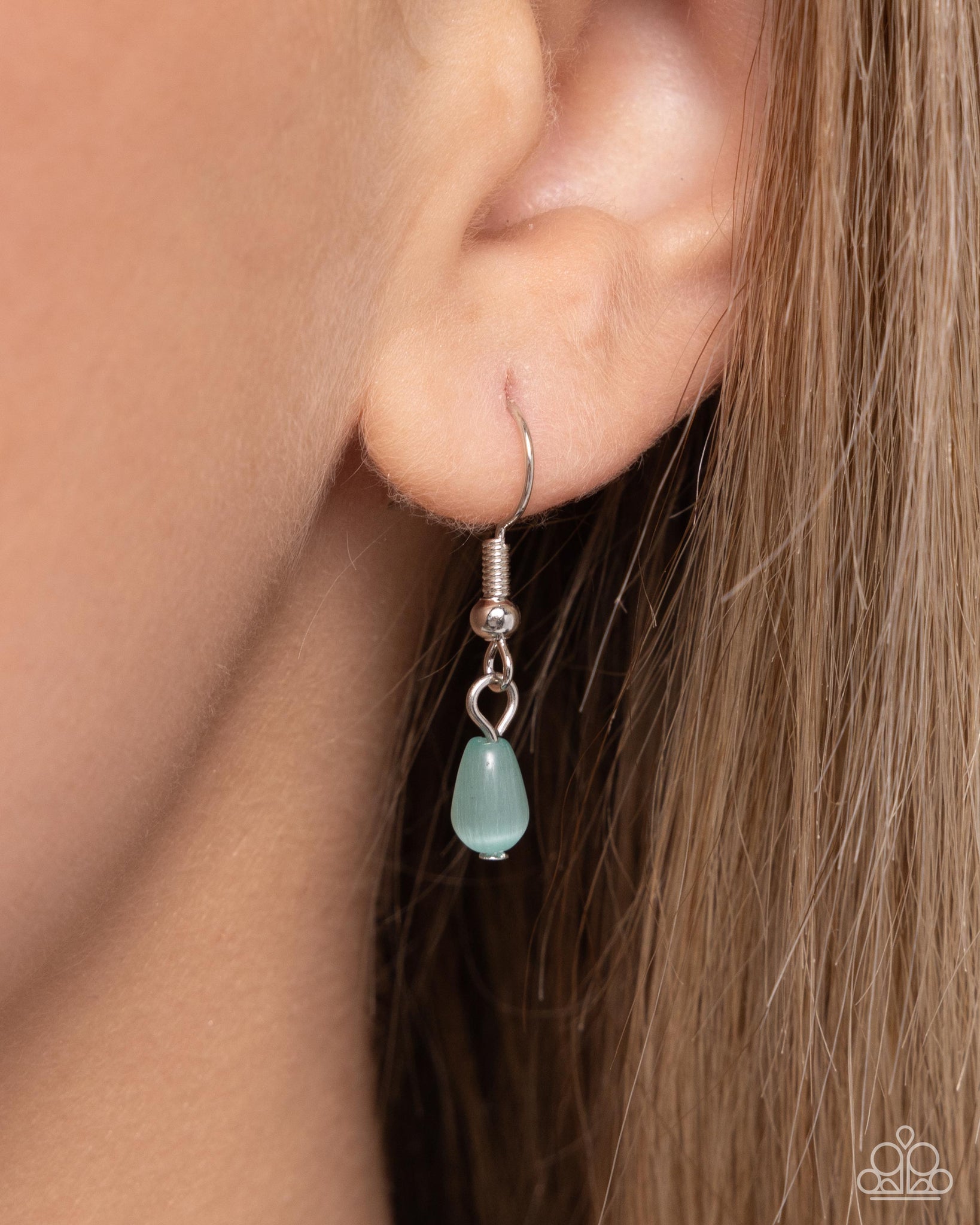 Accented with a cat's eye green teardrop, an oversized silver mermaid tail with lines of dainty white rhinestones, and a rectangular white shell, a silver ring is attached at the bottom of a lengthened silver chain for a mystically magical display. A lobster clasp hangs from the bottom of the design to allow a name badge or other item to be attached. Features an adjustable clasp closure.