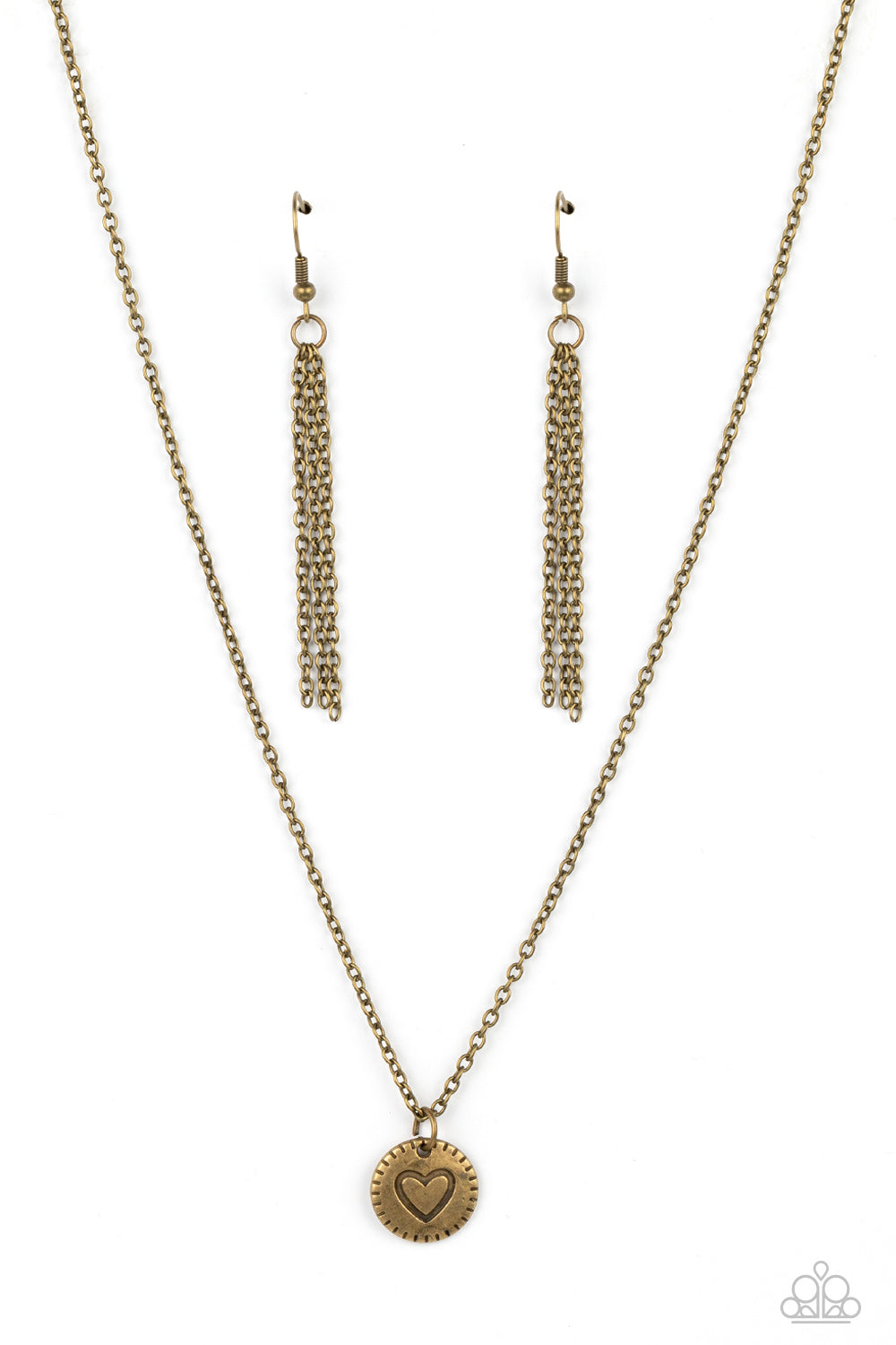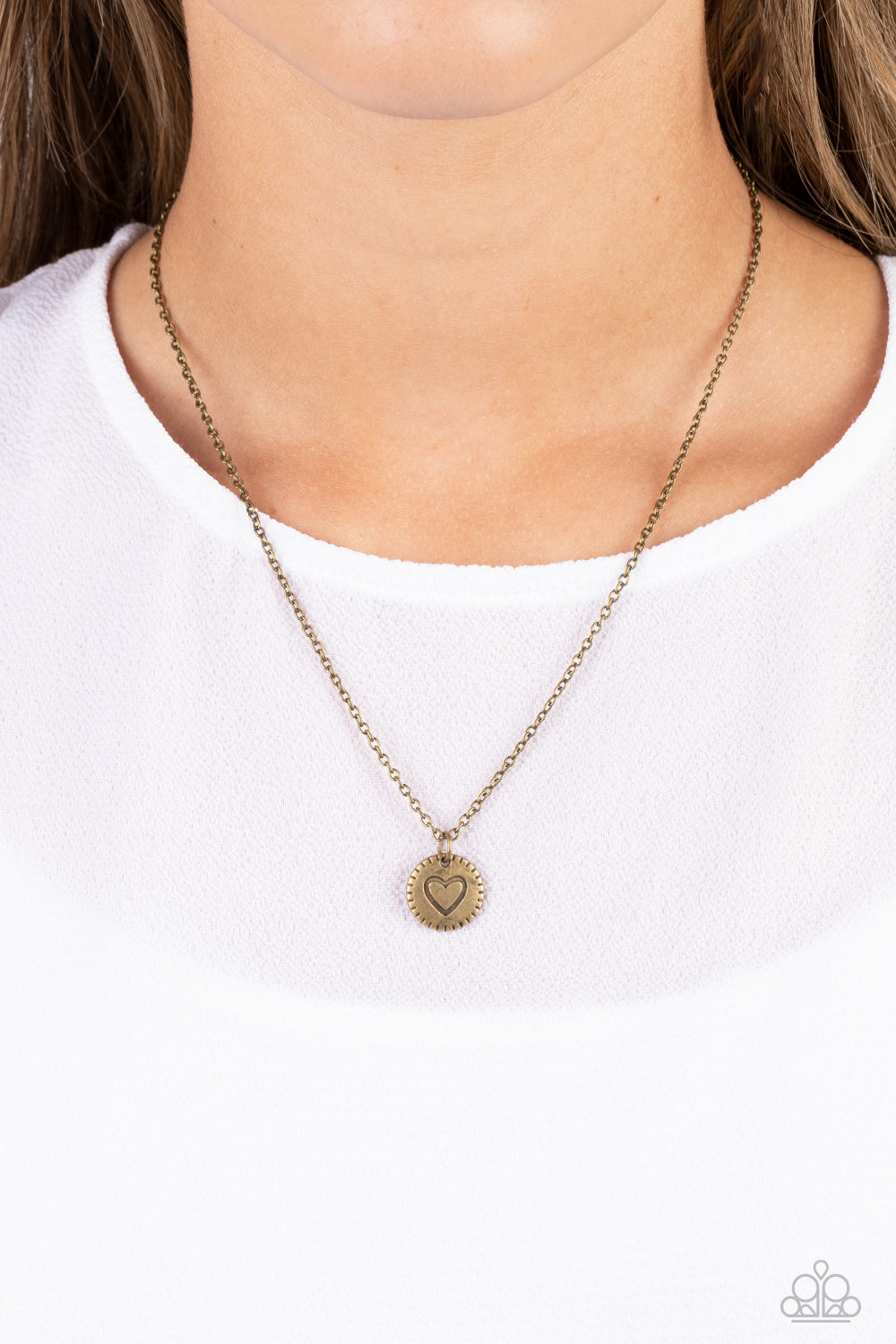 Stamped in a heart burst pattern, a round brass pendant is suspended from a dainty brass chain for a sentimental statement piece. Features an adjustable clasp closure.