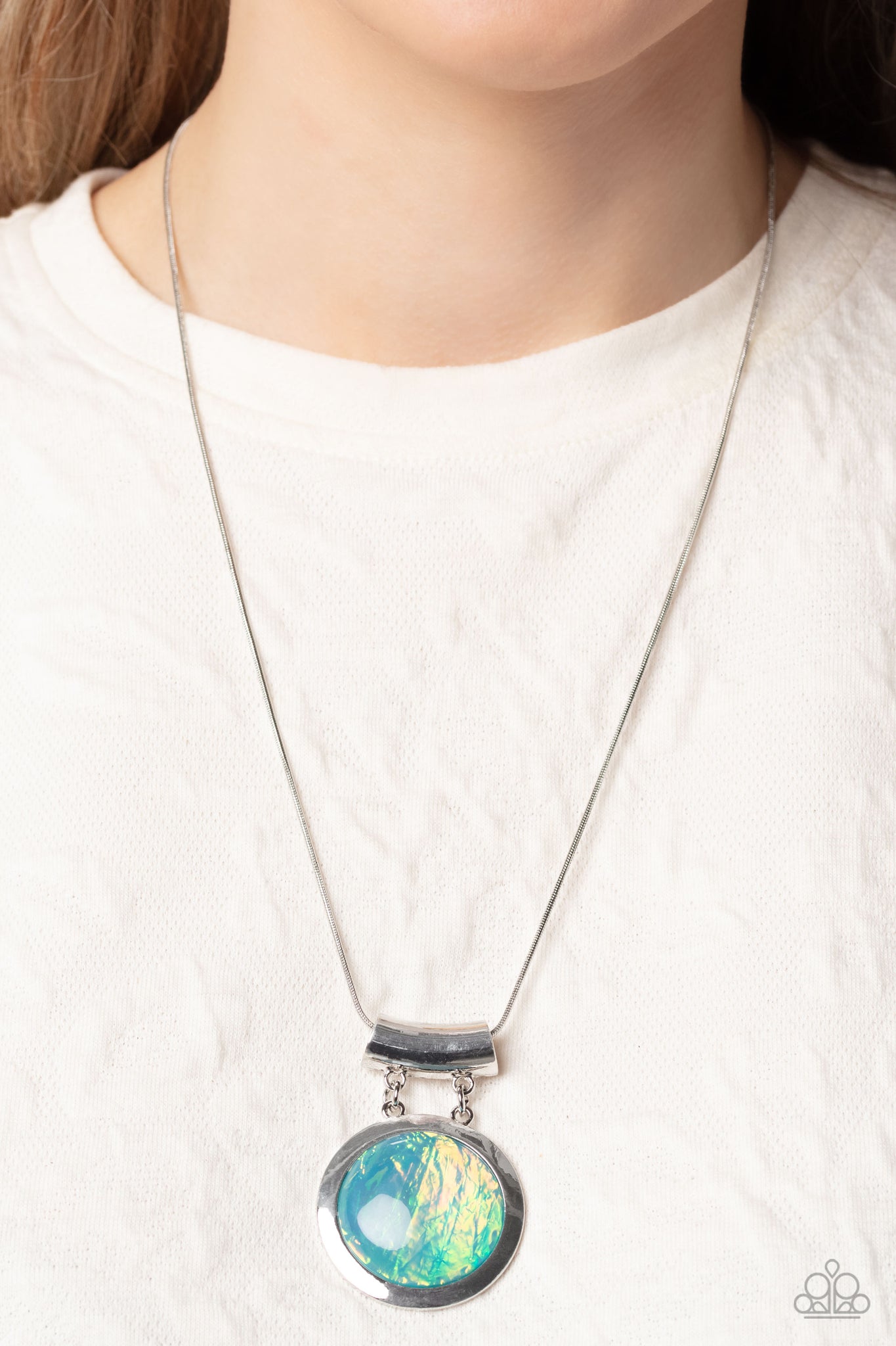 Featuring a refracted shimmer and an opalescent finish, an oversized, glassy blue gem falls along the chest on a silver snake chain to create a hypnotic pop of color. The exaggerated sparkle is pressed into a silver circular frame with a bowing silver frame, bringing a touch of metallic grit to the design. Features an adjustable clasp closure. Due to its prismatic palette, color may vary.