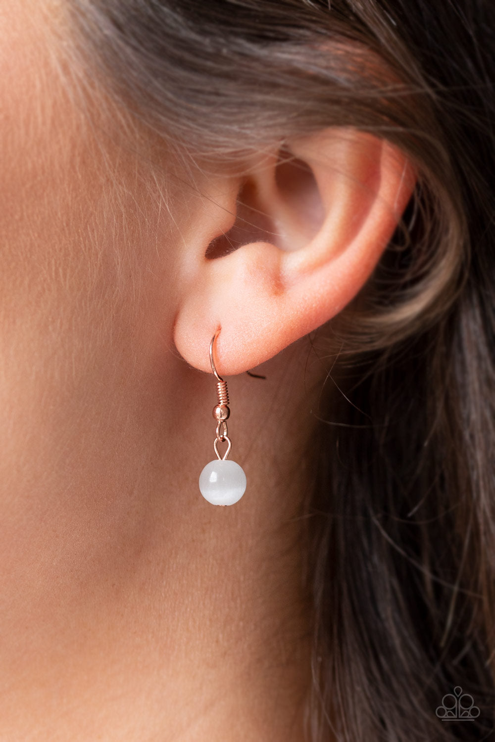 Studded shiny copper teardrops swing from the bottom of a shiny copper chain. A glowing cat's eye stone attaches to the innermost frame, creating a whimsical pendant. Features an adjustable clasp closure.