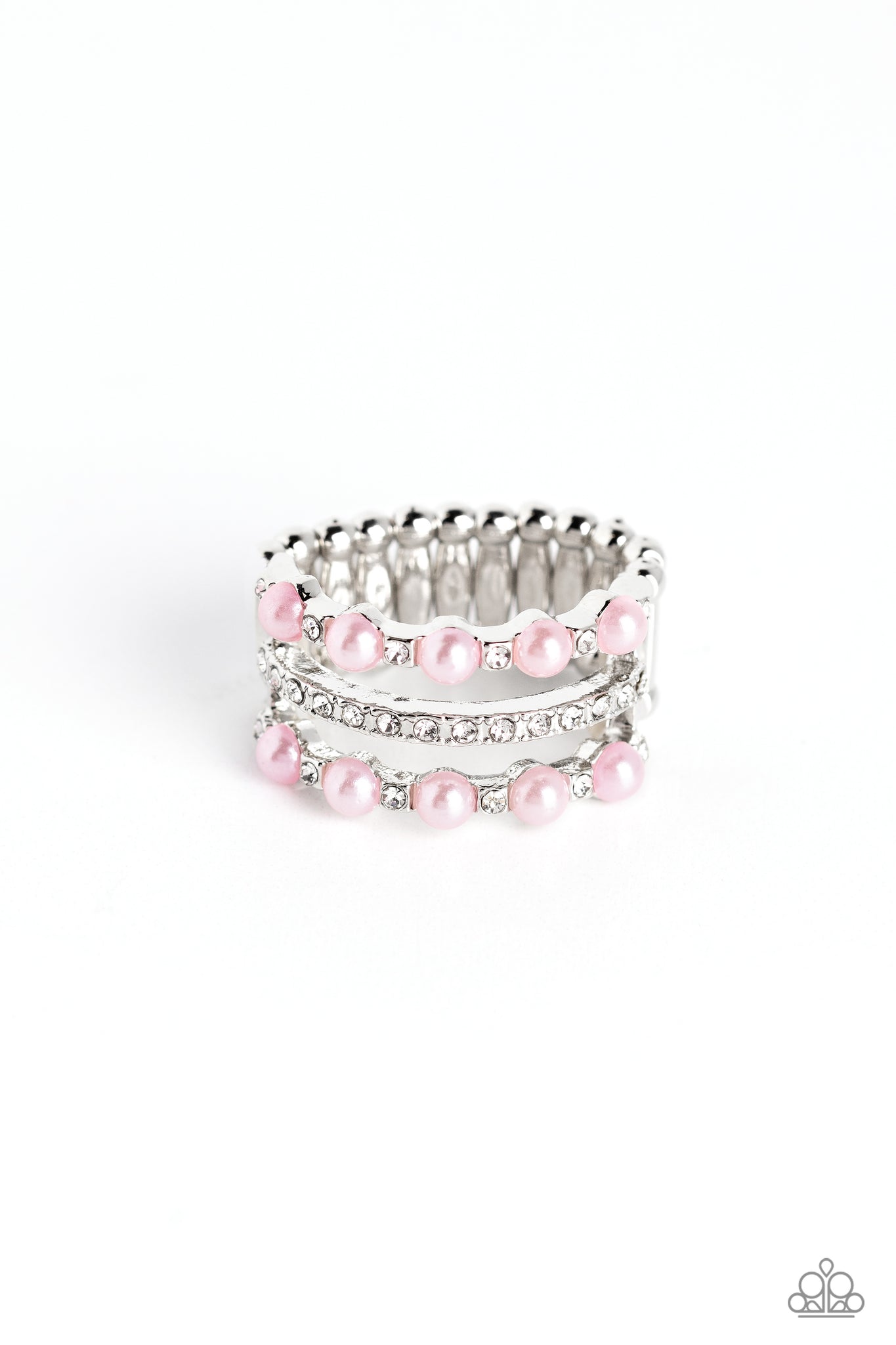 Dainty, bubbly baby pink pearls and glittery white rhinestones are sprinkled across three airy silver bands, creating a refined centerpiece. The centermost band features rhinestones only, drawing the eye to its subtle sparkle. Features a stretchy band for a flexible fit.