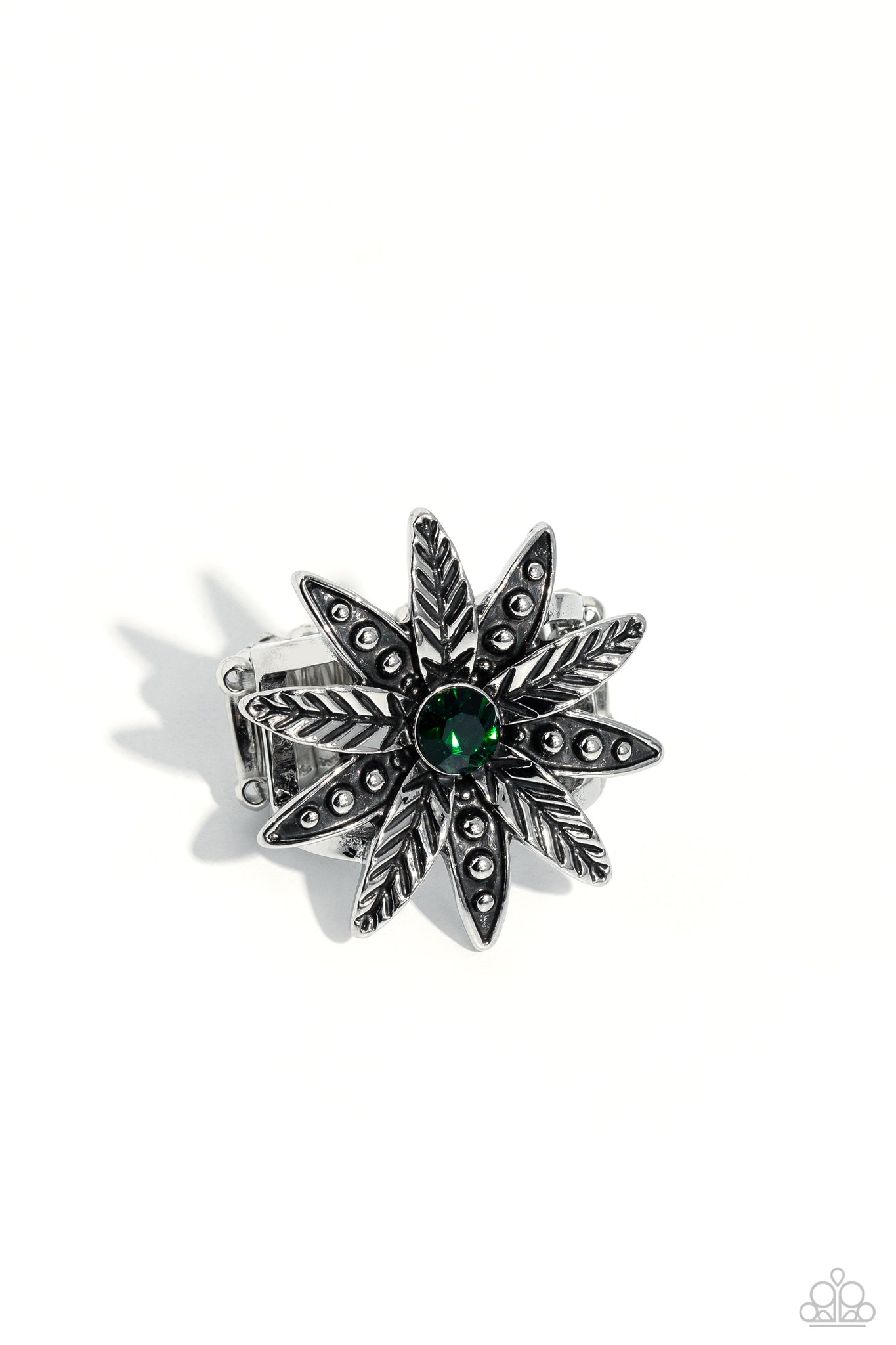 Unfurling around an emerald gem center, textured and studded silver petals alternate atop airy silver bands on the finger for a whimsically botanical centerpiece. Features a stretchy band for a flexible fit.