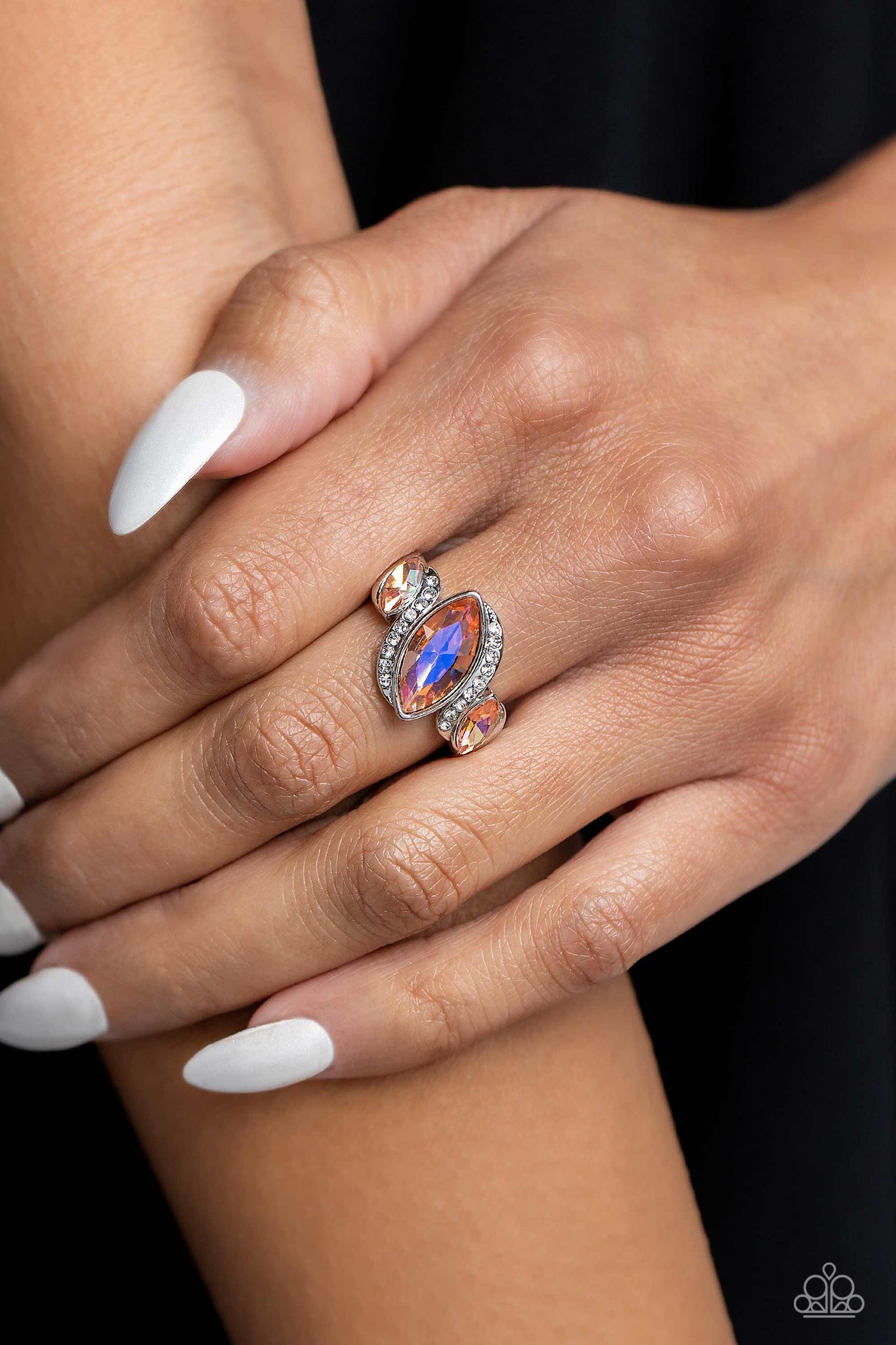 Flanked by two dainty silver curls encrusted in glassy white rhinestones, three tilted, glassy orange marquise-cut rhinestones, in varying sizes, embellish a shimmery silver band for a refined flair atop the finger. Features a dainty stretchy band for a flexible fit.