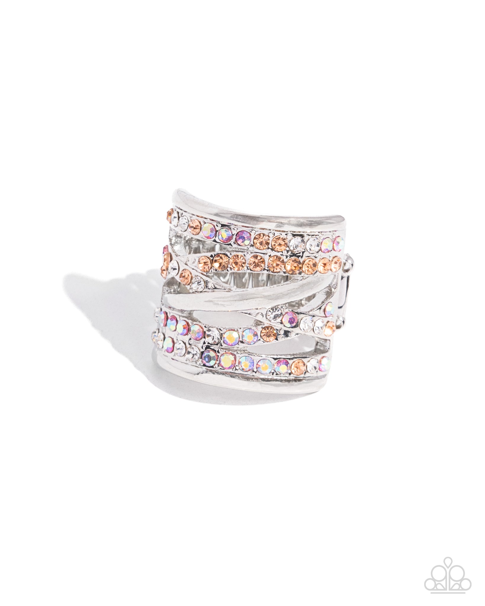 Lined with dainty white, light rose iridescent, and light peach rhinestones, glistening silver bars create the illusion of endless sparkle as they stack and arc across the finger creating a stunning backdrop for the rhinestones, allowing the skin to peek through the airy bands for a whimsical finish. Features a stretchy band for a flexible fit. Due to its prismatic palette, color may vary.