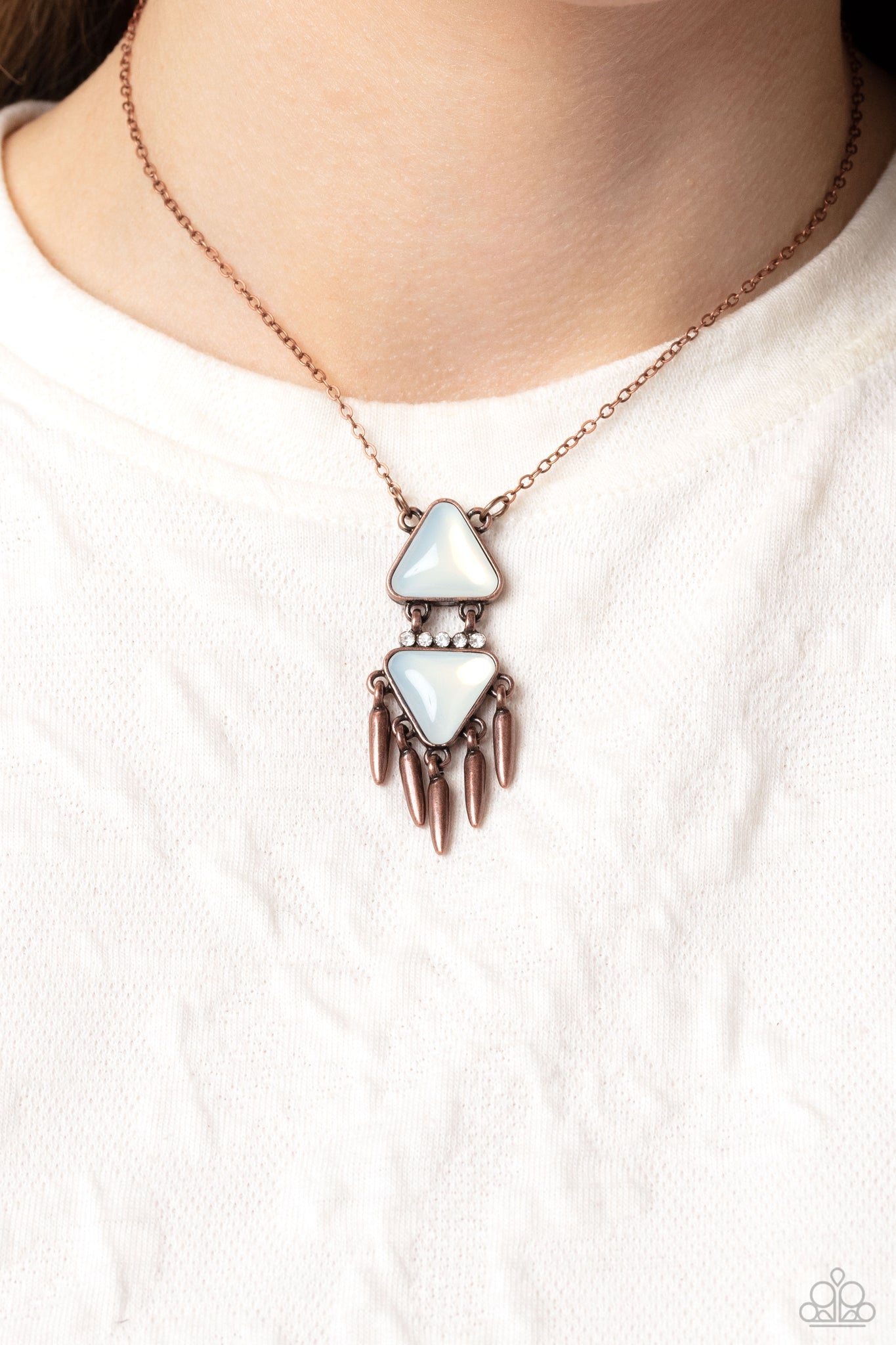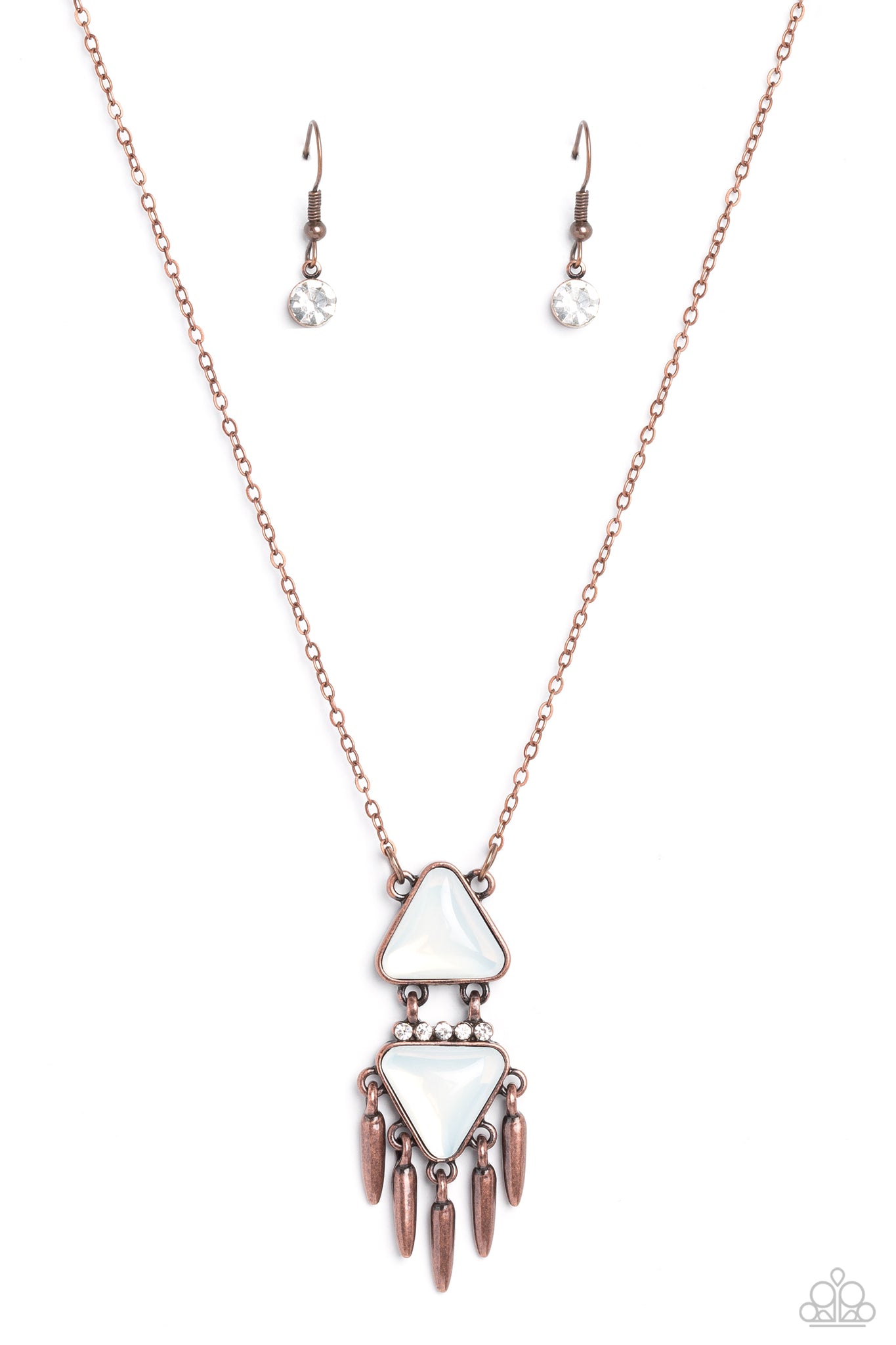 A dainty white opalescent triangle stacks onto a similar-sized, upside down triangle in the same hue, creating an edgy geometric copper pendant. Encrusted along the airy space between the two triangles, a row of white rhinestones glimmer creating a pop of shimmer on the geometric design. A fringe of oblong copper beads hangs from the triangular display for a noise-making design. Features an adjustable clasp closure.